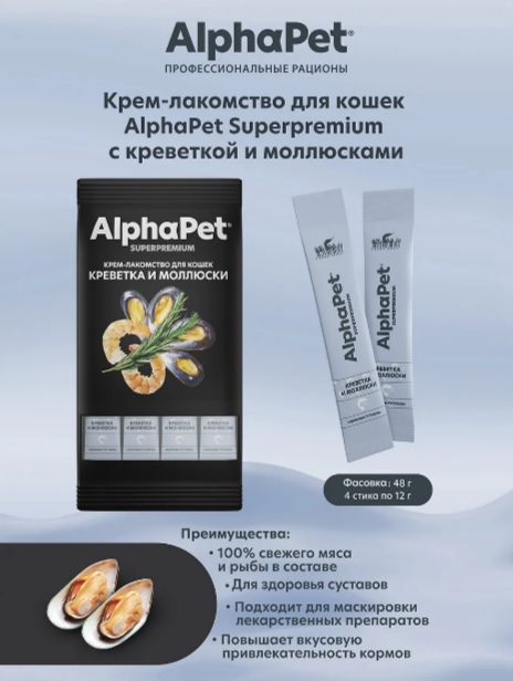 Крем-лакомство AlphaPet® Superpremium – это не просто лакомство, а изысканное угощение, воплощающее саму суть роскоши и нежности. Словно шелковая симфония вкуса, рождается оно в гармонии отборных ингредиентов, тающей текстуры и восхитительного аромата, даря вашей кошке моменты истинного блаженства.